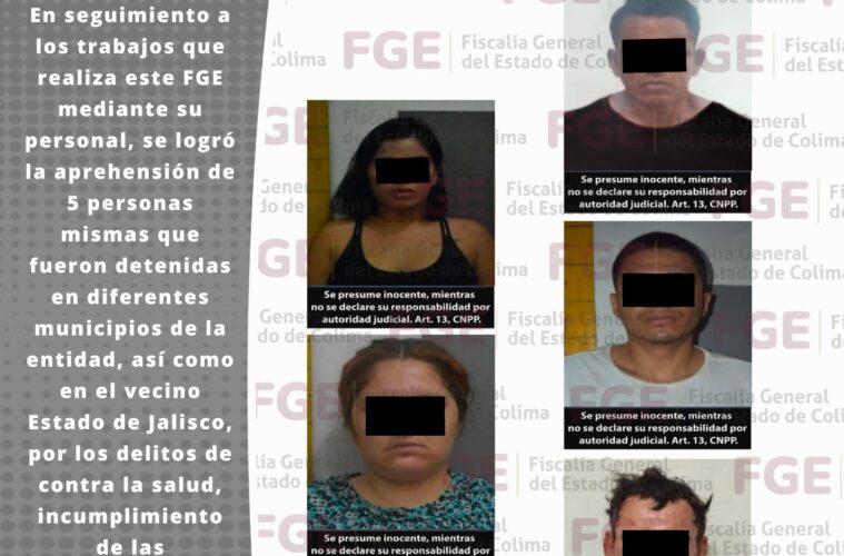 En seguimiento a los trabajos que realiza este FGE mediante su personal, se logró la aprehensión de 5 personas mismas que fueron detenidas en diferentes municipios de la entidad, así como en el vecino Estado de Jalisco, por los delitos de contra la salud, incumplimiento de las obligaciones de asistencia familiar y robo.