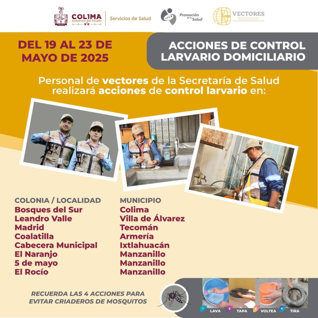 La Secretaría de Salud del Gobierno del Estado de Colima continúa con las acciones de control larvario en los cinco municipios considerados de riesgo por dengue, donde se han registrado casos probables y altos índices del mosquito transmisor. Además, la próxima semana se ampliarán las labores a la cabecera municipal de Ixtlahuacán.
