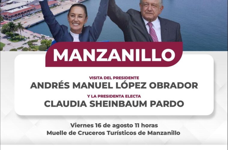 Durante su gira por el estado de Colima, el titular del Poder Ejecutivo federal, quien estará acompañado de la presidenta electa, Claudia Sheinbaum Pardo y la gobernadora Indira Vizcaíno Silva, realizará un recorrido, y en punto de las 11:00 horas dará un mensaje a la población en el Muelle de Cruceros de Turísticos, ubicado en el centro histórico.