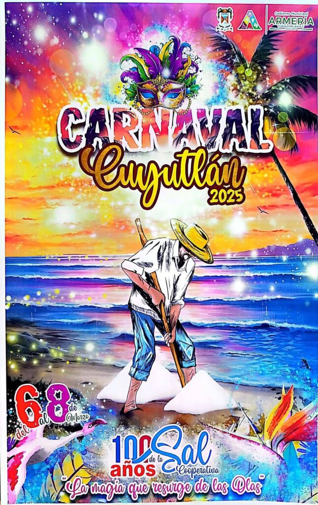 Ivan Omar Corona Yepez ha creado un cartel que no solo celebra la esencia de este hermoso pueblo salinero, sino también marca el centenario de la cooperativa de salineros de Cuyutlán. El eslogan «La Magia que Resurge de las Olas» realmente captura la historia y la cultura de la región. ¡Todos invitados a disfrutar de este Carnaval del 6 al 8 de marzo en Cuyutlán!