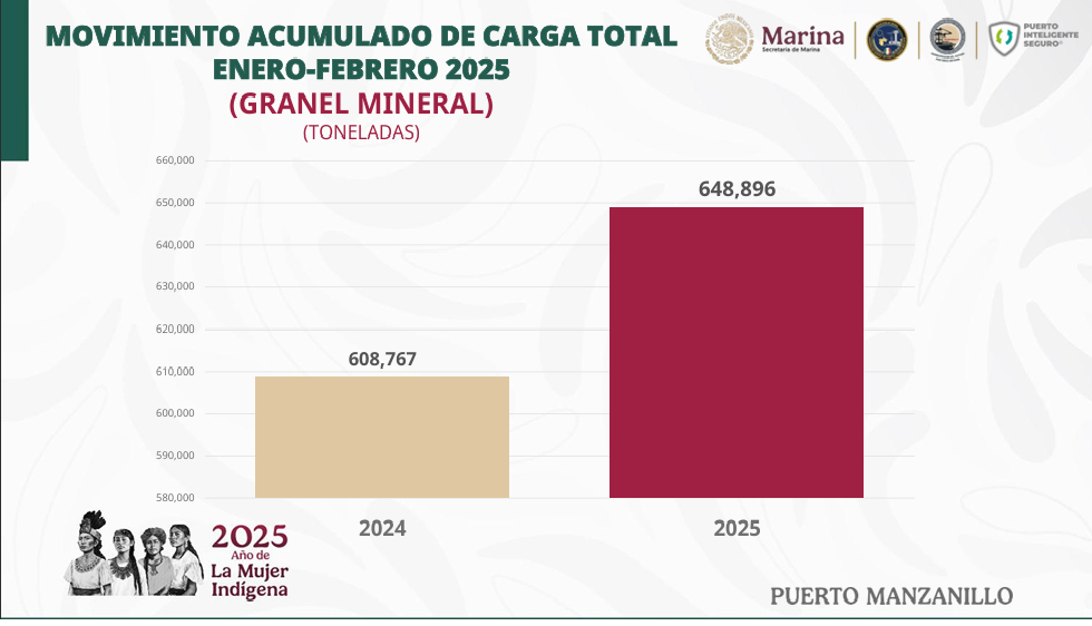 El movimiento acumulado de carga total, granel mineral,  Enero-Febrero de este año  2025, es de 648, mil 896 toneladas, reflejando un incremento del 40 mil toneladas, comparado con el año 2024, en el que se movilizaron 608, mil 767 toneladas.