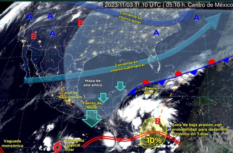 Hoy viernes 3 de noviembre, el frente frío número 8 permanecerá estacionario sobre el occidente del Mar Caribe, interaccionará con una baja presión con probabilidad para desarrollo ciclónico, produciendo lluvias puntuales muy fuertes en la Península de Yucatán, con puntuales intensas en Quintana Roo.