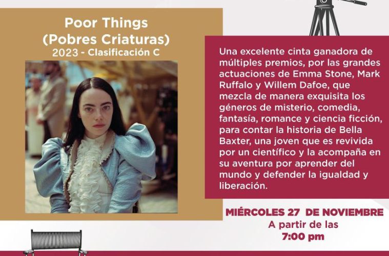 La cita para la segunda función es mañana miércoles 27 de noviembre a partir de las 7:00 pm, en el Salón 1 del Centro Cultural Salagua (Octavio Paz S/N, Nuevo Salagua). Se proyectará la película “Poor Things” (Pobres Criaturas en México) de 2023, reconocida y premiada por la Academia y en los mejores festivales de cine del mundo, gracias a las excelentes actuaciones de Emma Stone, Mark Ruffalo y Willem Dafoe, además de que mezcla de manera exquisita los géneros de misterio, comedia, fantasía, romance y ciencia ficción. Este filme es categoría “C” y solo podrán ingresar personas adultas de 18 años o más.