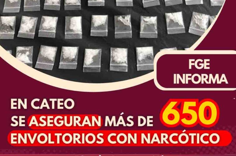 La Fiscalía General del Estado (FGE) aseguró más de 600 envoltorios y una bolsa de plástico con metanfetamina, 50 bolsas de plástico junto con un paquete emplayado que contenía hierba verde y seca, un arma de fuego con su cargador abastecido y 25 cartuchos útiles, al catear un domicilio el pasado 15 de octubre del presente año en colonia San José de la ciudad de Manzanillo.