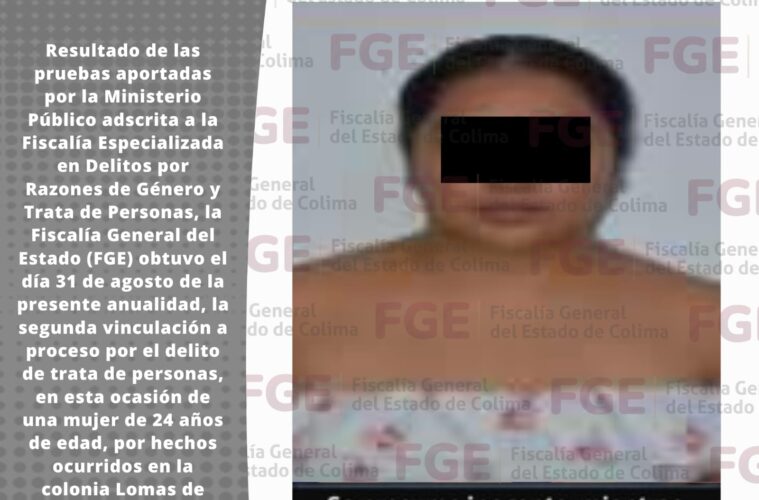 Resultado de las pruebas aportadas por la Ministerio Público adscrita a la Fiscalía Especializada en Delitos por Razones de Género y Trata de Personas, la Fiscalía General del Estado (FGE) obtuvo el día 31 de agosto de la presente anualidad, la segunda vinculación a proceso por el delito de trata de personas, en esta ocasión de una mujer de 24 años de edad, por hechos ocurridos en la colonia Lomas de Circunvalación en el municipio de Colima.