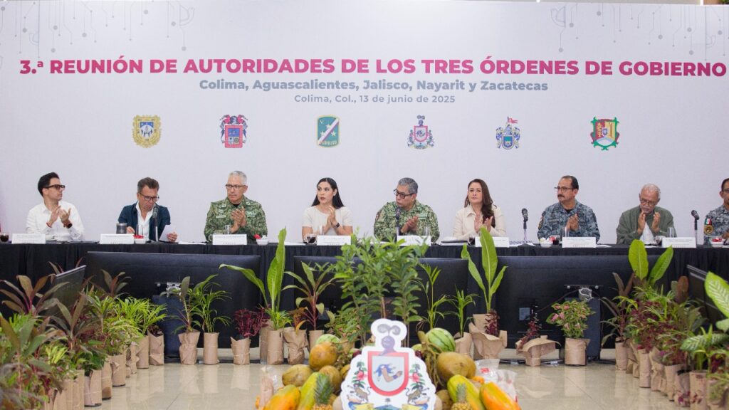 La gobernadora Indira Vizcaíno Silva recibió en la Vigésima Zona Militar de Colima, a la mandataria de Aguascalientes, María Teresa Jiménez Esquivel; los gobernadores Pablo Lemus Navarro de Jalisco y Miguel Ángel Navarro Quintero de Nayarit, así como a Rodrigo Reyes Mugüerza, secretario general del Gobierno de Zacatecas, y demás autoridades que participaron en la Tercera Reunión de Autoridades de los Tres Órdenes de Gobierno.