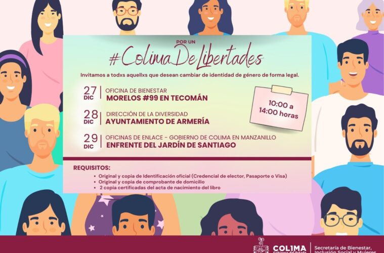 Con el objetivo de seguir promoviendo la inclusión de las personas TTTrans, la Dirección de Atención a la Diversidad Sexual y de Género de la Secretaría de Bienestar, Inclusión social y Mujeres (Sebiinsom) del Gobierno del Estado de Colima, abre la última campaña del año 2023 con acompañamiento y asesoramiento ‘Por un #ColimaDeLibertades’ que busca apoyar a personas TTTrans para que accedan a su identidad de género autopercibida de forma legal.