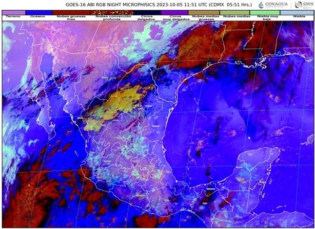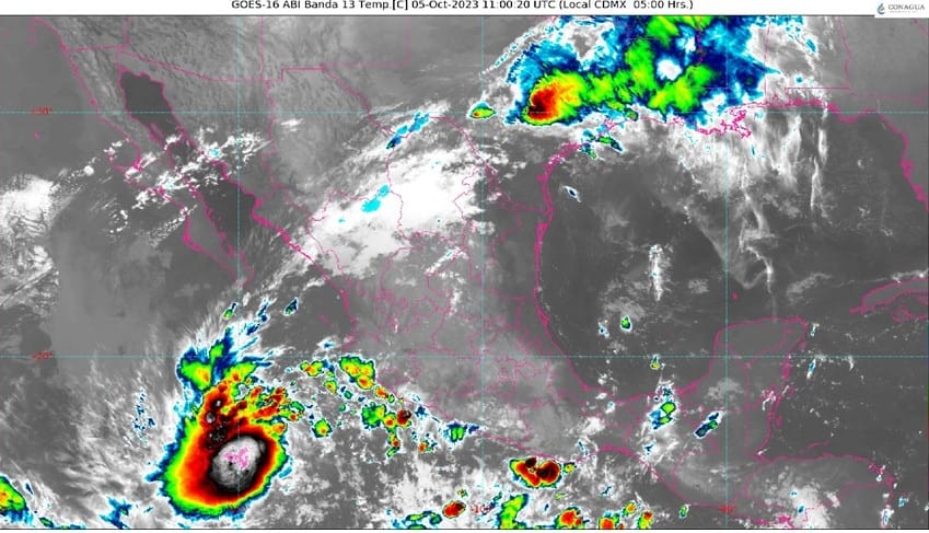 El Servicio Meteorológico Nacional (SMN) informó en su reporte de las 06:00 horas que hoy jueves 5 de octubre se prevén lluvias puntuales fuertes y actividad eléctrica en entidades del noroeste y centro de la República Mexicana, que se verán reforzadas en el occidente del país, por los desprendimientos nubosos del ciclón tropical ‘Lidia’, localizado al oeste-suroeste de Manzanillo, Colima.