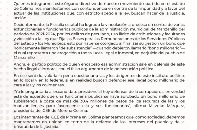 Recientemente, la Fiscalía estatal ha logrado la vinculación a proceso en contra de varias exfuncionarias y funcionarios públicos de la administración municipal de Manzanillo del periodo de 2021-2024, por los delitos de peculado, uso ilícito de atribuciones y facultades y violación a la Ley que Fija las Bases para las Remuneraciones de los Servidores Públicos del Estado y los Municipios, esto por haberse otorgado al finalizar su gestión un bono que irónicamente llamaron “de subsistencia” —cuando debieron llamarlo “bono millonario”— el cual representa una erogación a todas luces ilegal e inmoral, en perjuicio del pueblo de Manzanillo.
