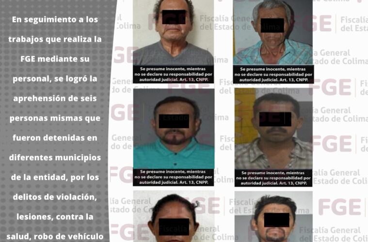 En seguimiento a los trabajos que realiza la FGE mediante su personal, se logró la aprehensión de seis personas mismas que fueron detenidas en diferentes municipios de la entidad, por los delitos de violación, lesiones, contra la salud, robo de vehículo y robo.